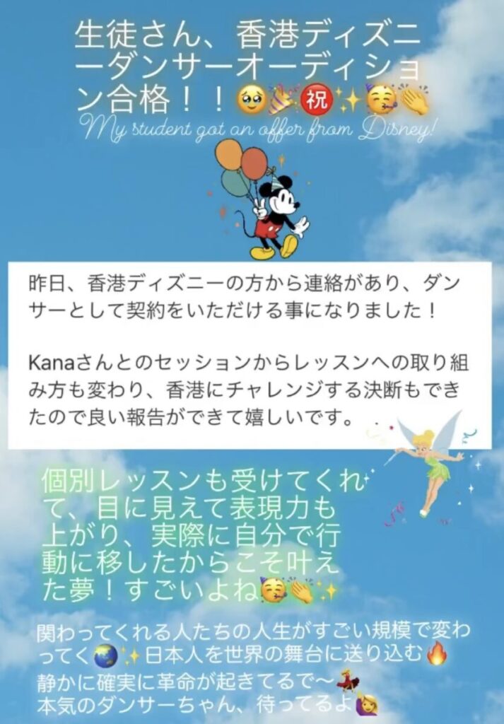 これまで多くの方の海外挑戦をサポートし、100人に1人程の倍率でしか受からないアメリカクルーズラインや香港ディズニーなど、世界で活躍するプロパフォーマーを10名以上輩出してきました。