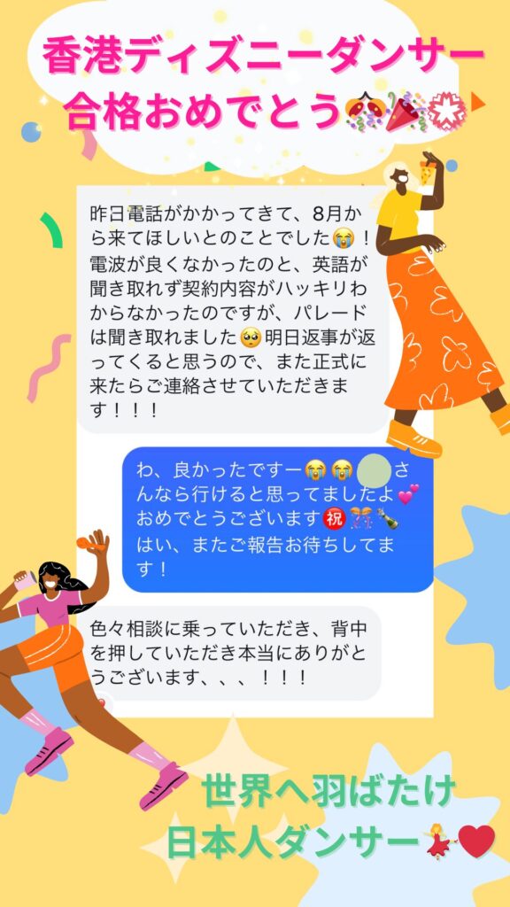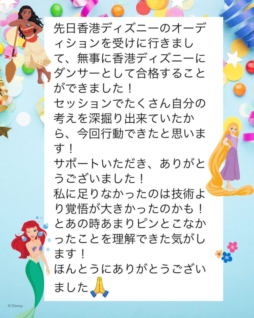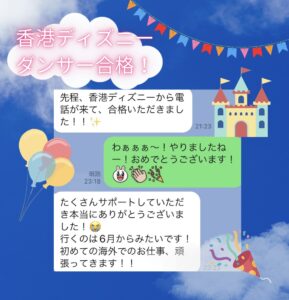 私の対面レッスン1回でテーマパークに必要な表現力、彼女の良さの再認識、パフォーマンスのやり方を伝授したところ、明らかに変わり、東京ディズニーの1次合格、香港ディズニーの最終選考まで進み、見事合格。夢を叶えることができました☺️